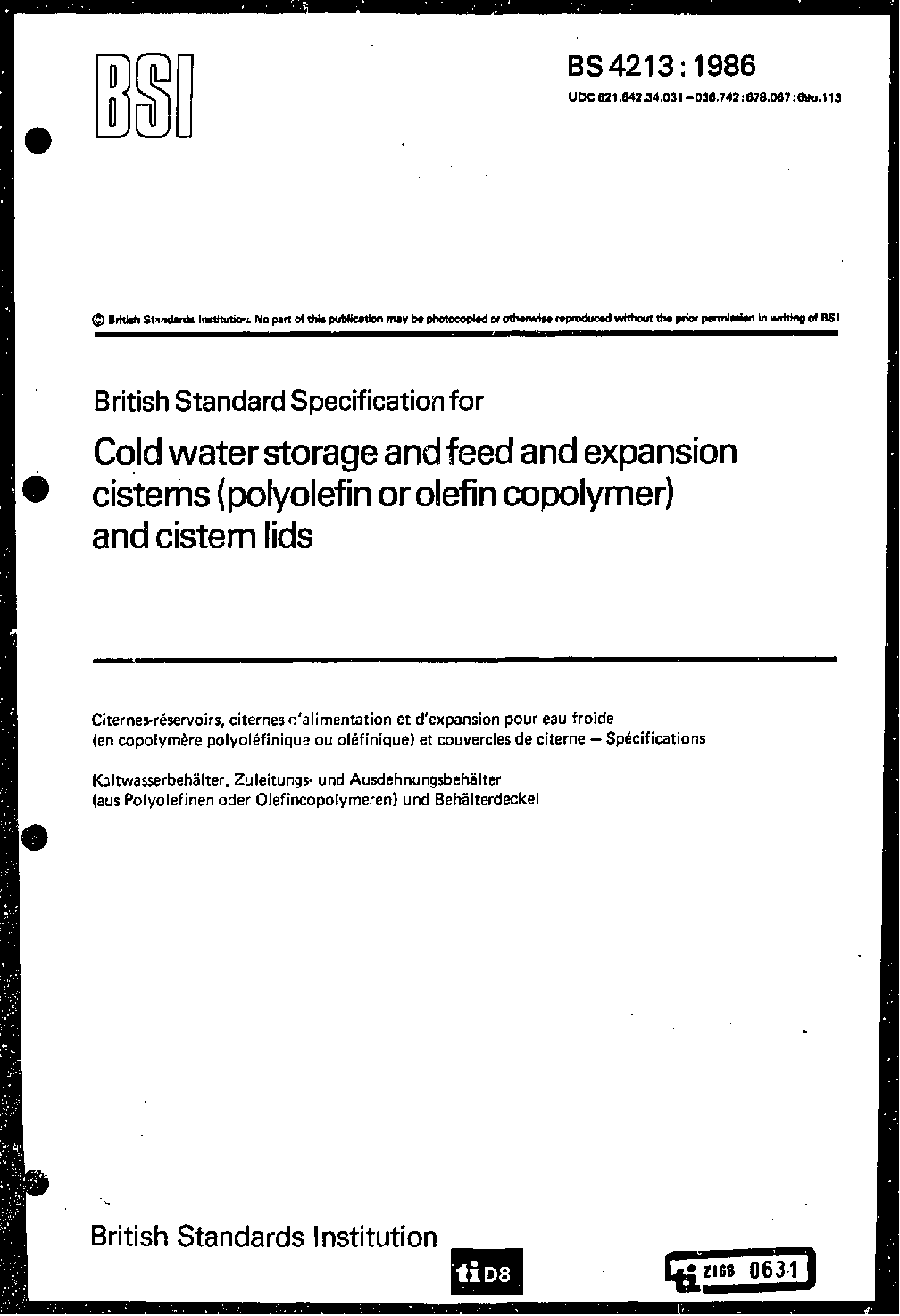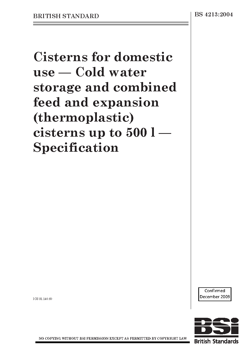 Specification for cold water storage cisterns (polyolefin or olefin copolymer) and cistern covers