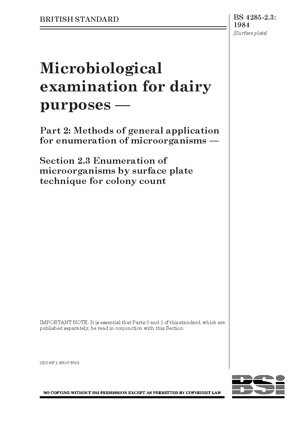 Microbiological examination for dairy purposes. Methods of general application enumeration microorganisms Enumeration by surface plate technique colony count
