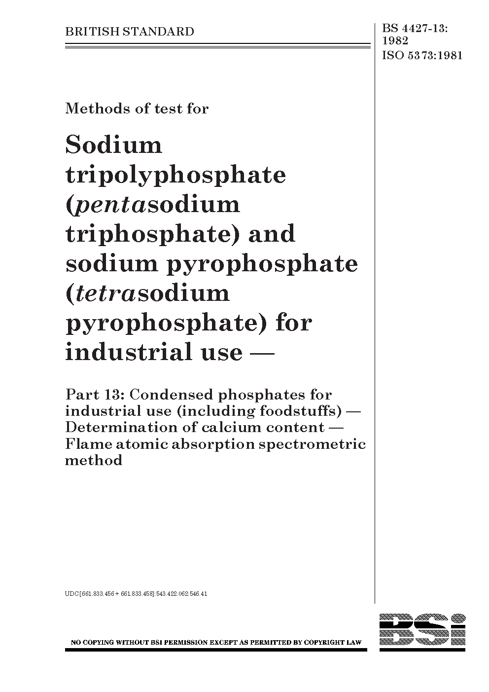 Methods of test for sodium tripolyphosphate (pentasodium triphosphate) and pyrophosphate (tetrasodium pyrophosphate) industrial use Condensed phosphates (including foodstuffs) - determination calcium content flame atomic absorption spectrometric method