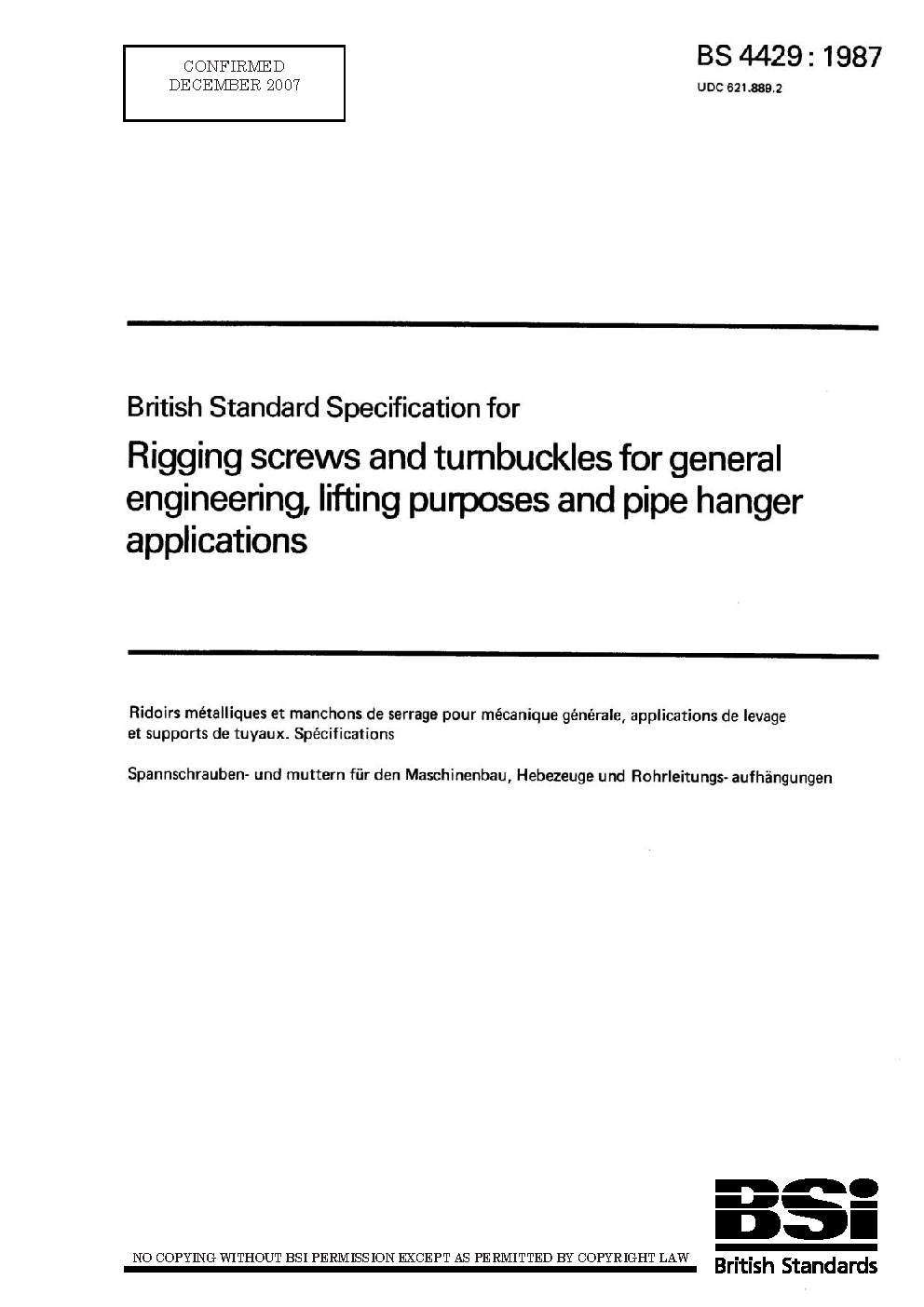 Specification for rigging screws and turnbuckles for general engineering, lifting purposes and pipe hanger applications