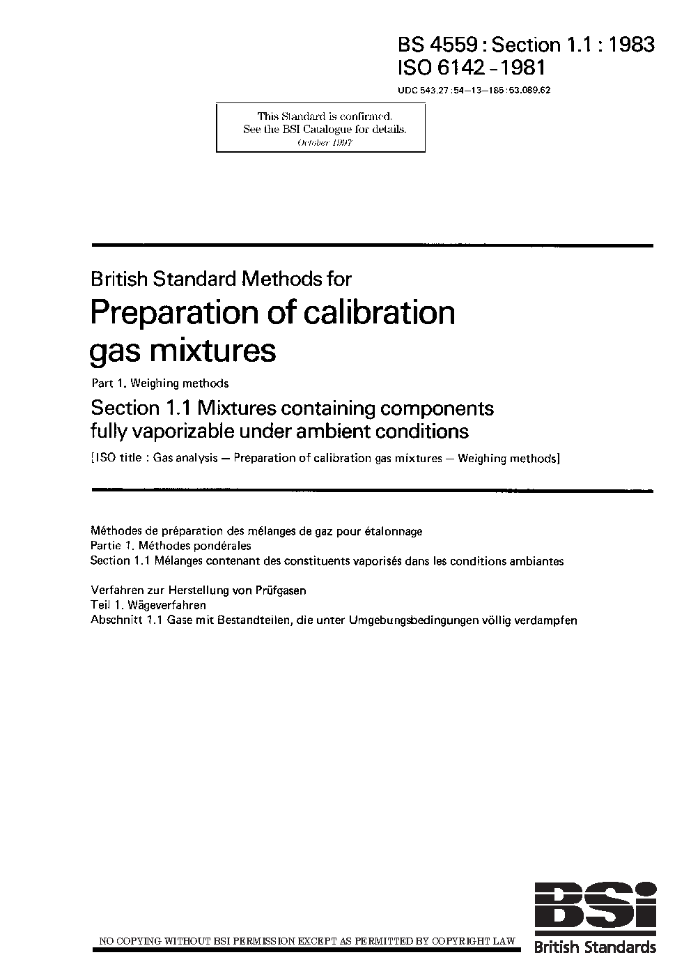 Methods for preparation of calibration gas mixtures. Weighing methods Mixtures containing components fully vaporizable under ambient conditions