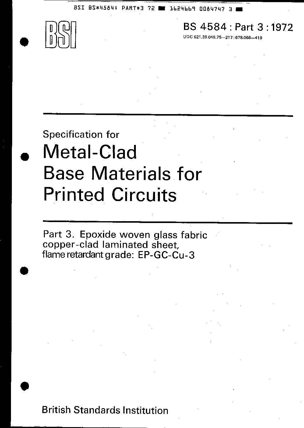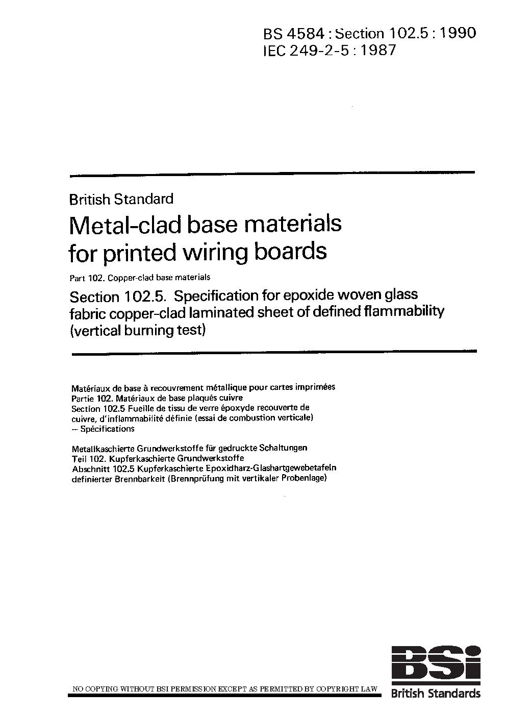 Metal-clad base materials for printed wiring boards. Copper-clad Specification epoxide woven glass fabric copper-clad laminated sheet of defined flammability (vertical burning test)