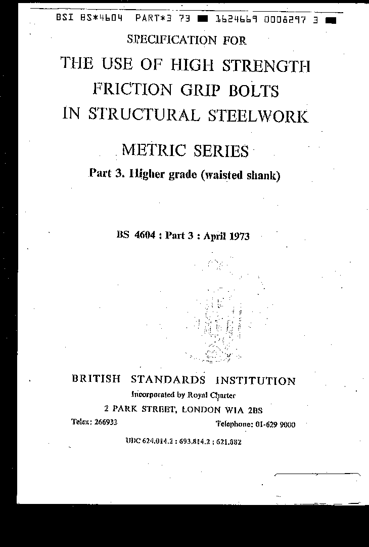 Specification for the use of high strength friction grip bolts in structural steelwork. Metric series Higher grade (waisted shank)