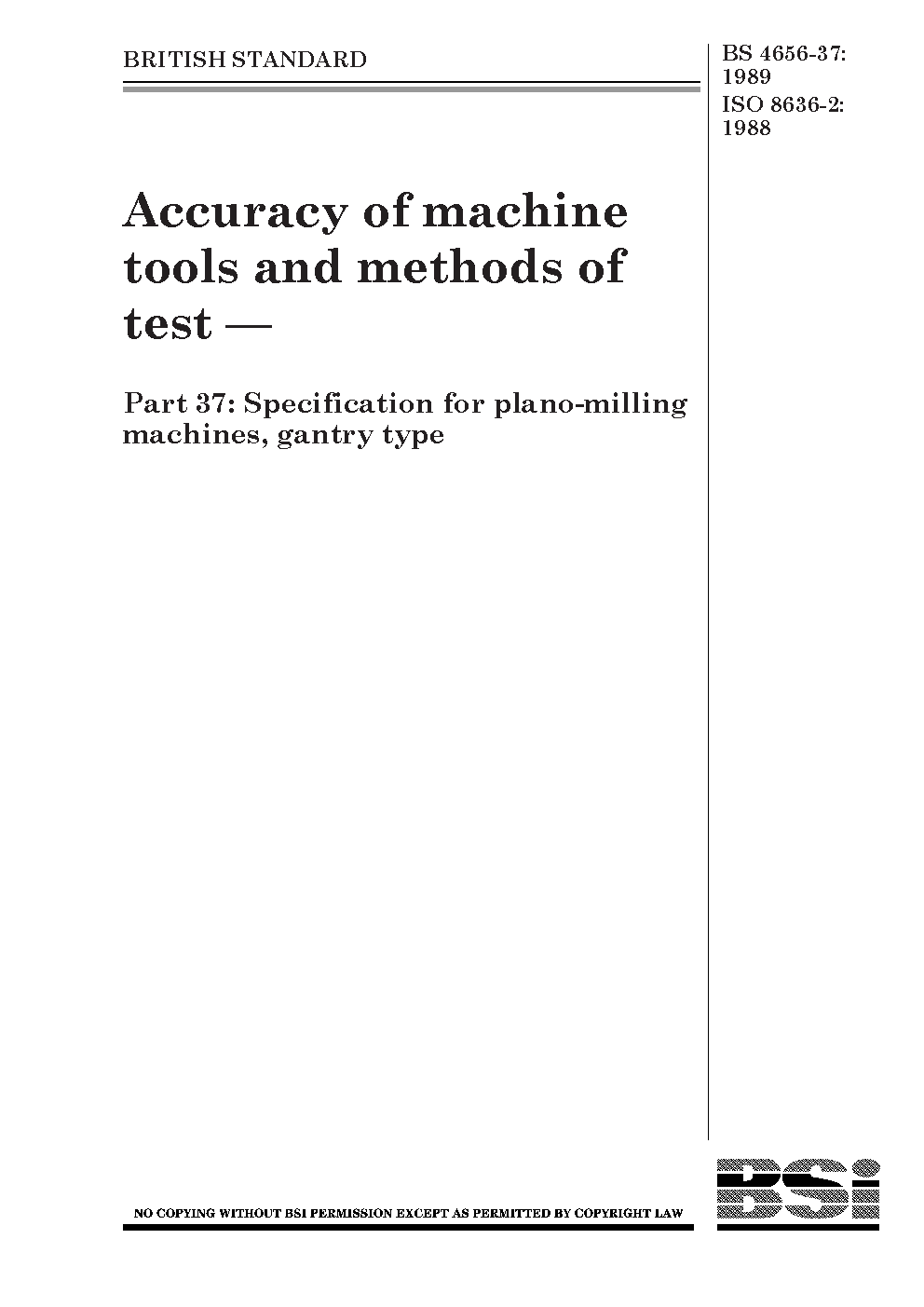 Accuracy of machine tools and methods test Specification for plano-milling machines, gantry type