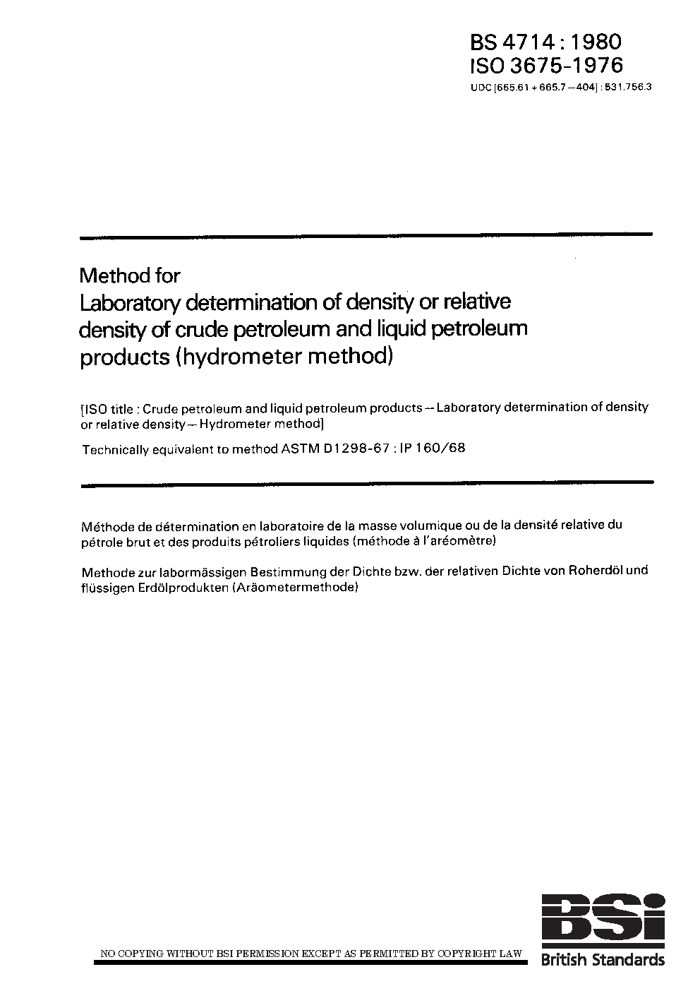 Method for laboratory determination of density or relative density of crude petroleum and liquid petroleum products (hydrometer method)