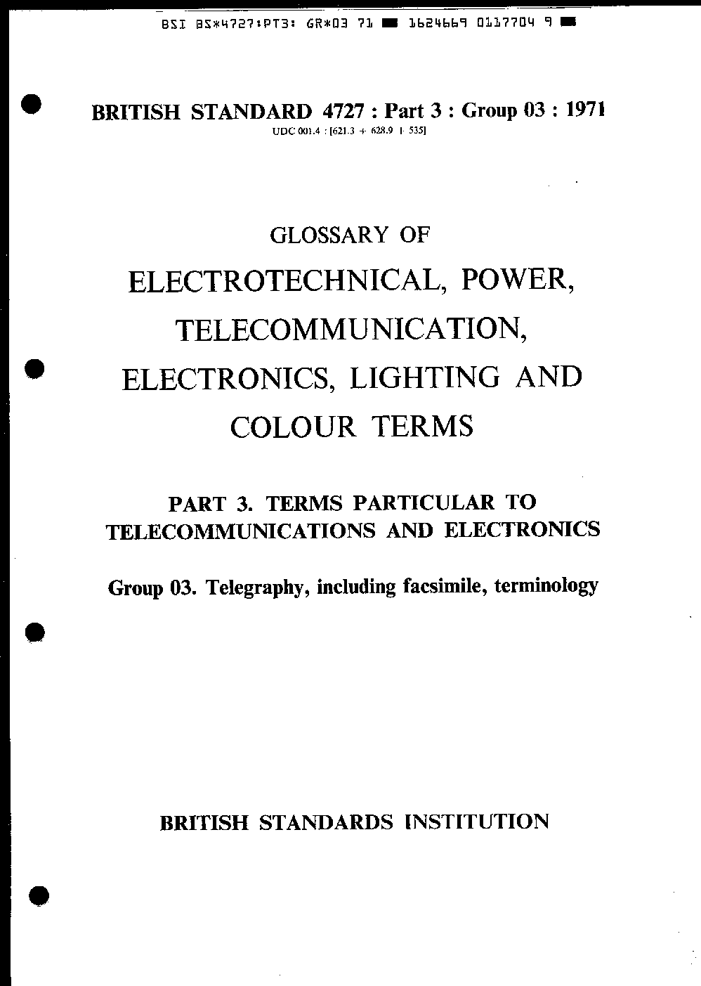 Glossary of electrotechnical, power, telecommunication, electronics, lighting and colour terms. Terms particular totelecommunications electronics Telegraphy, including facsimile, terminology