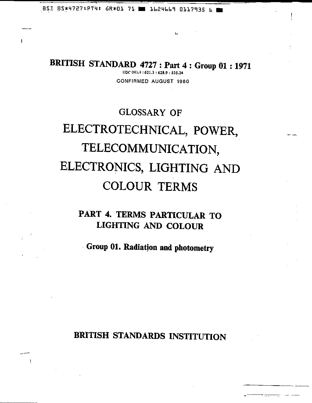 Glossary of electrotechnical, power, telecommunication, electronics, lighting and colour terms. Terms particular to andcolour Radiation photometry