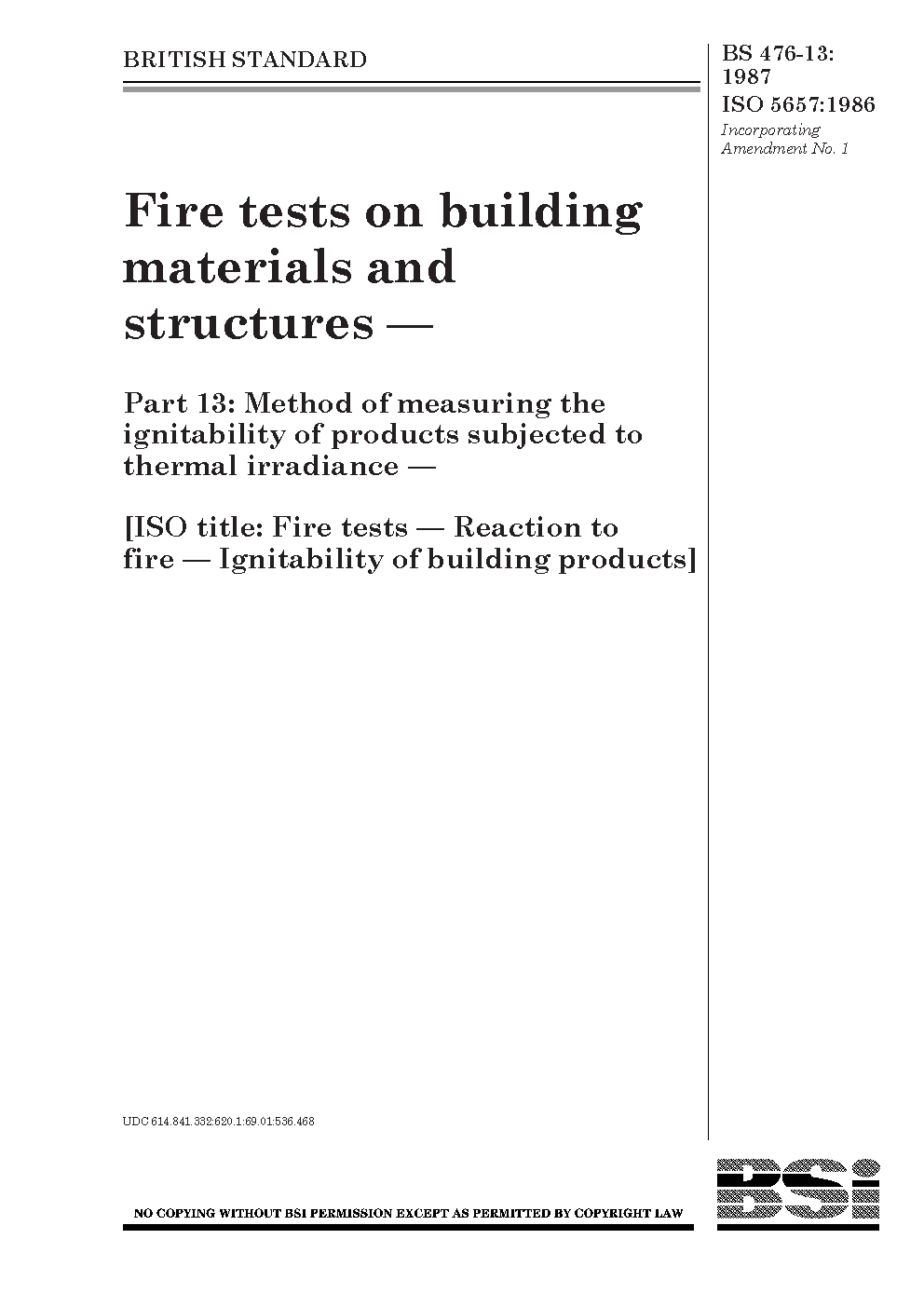 Fire tests on building materials and structures Method of measuring the ignitability products subjected to thermal irradiance