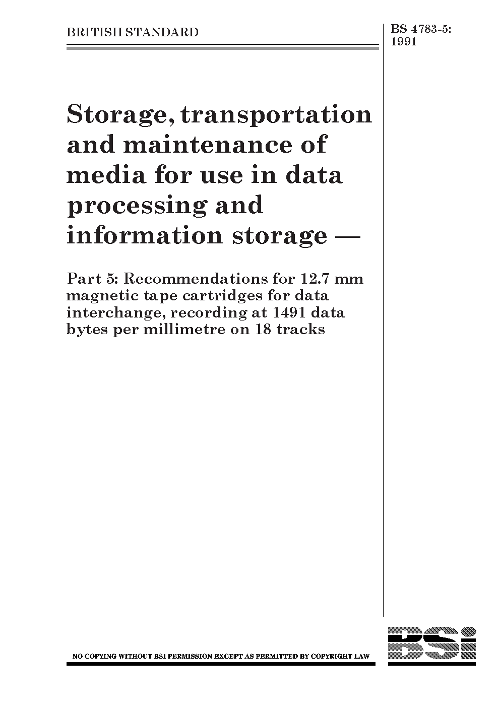 Storage, transportation and maintenance of media for use in data processing information storage Recommendations 12.7 mm magnetic tape cartridges interchange, recording at 1491 bytes per millimetre on 18 tracks