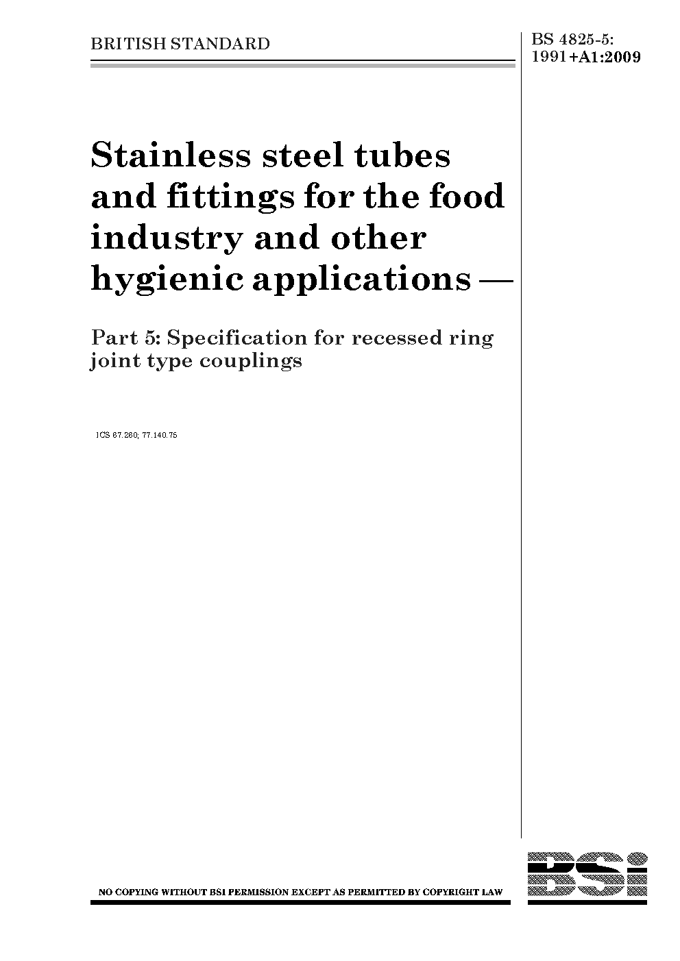 Stainless steel tubes and fittings for the food industry other hygienic applications Specification recessed ring joint type couplings