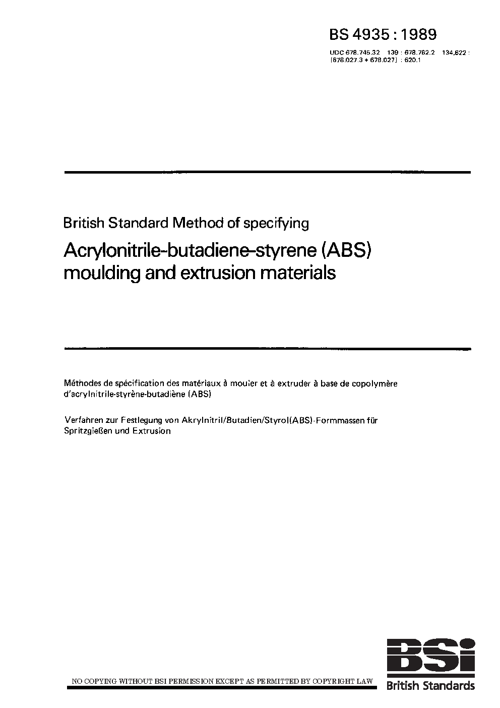 Specification for acrylonitrile-butadiene-styrene (ABS) moulding and extrusion materials