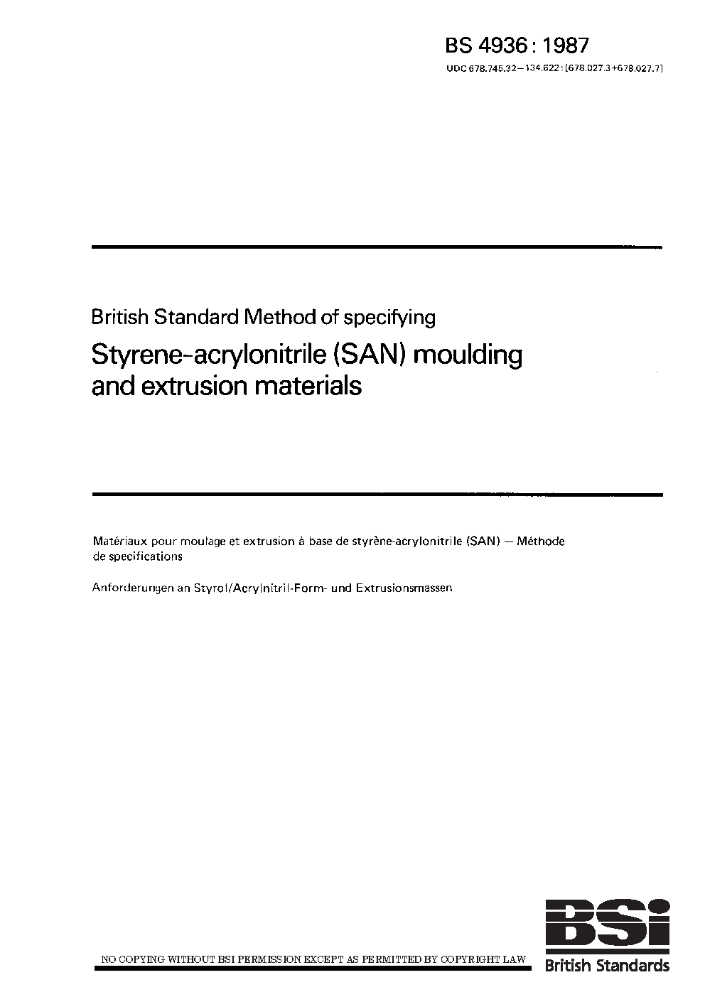 Specification for styrene-acrylonitrile (SAN) moulding and extrusion materials