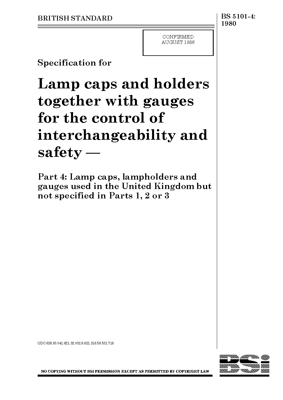 Specification for lamp caps and holders together with gauges the control of interchangeability safety Lamp caps, lampholders used in United Kingdom but not specified Parts 1, 2 or 3