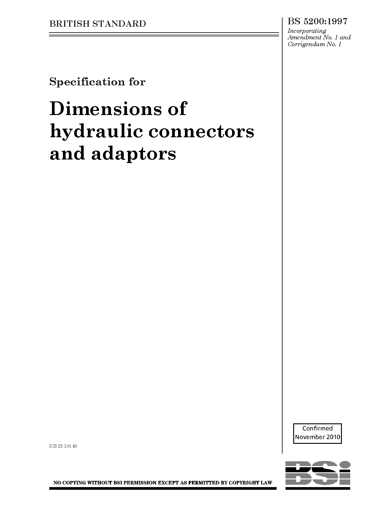 Specification for dimensions of hydraulic connectors and adaptors