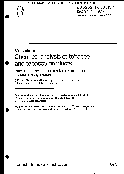 Methods for chemical analysis of tobacco and products Determination alkaloid retention by filters cigarettes (spectrometric method)