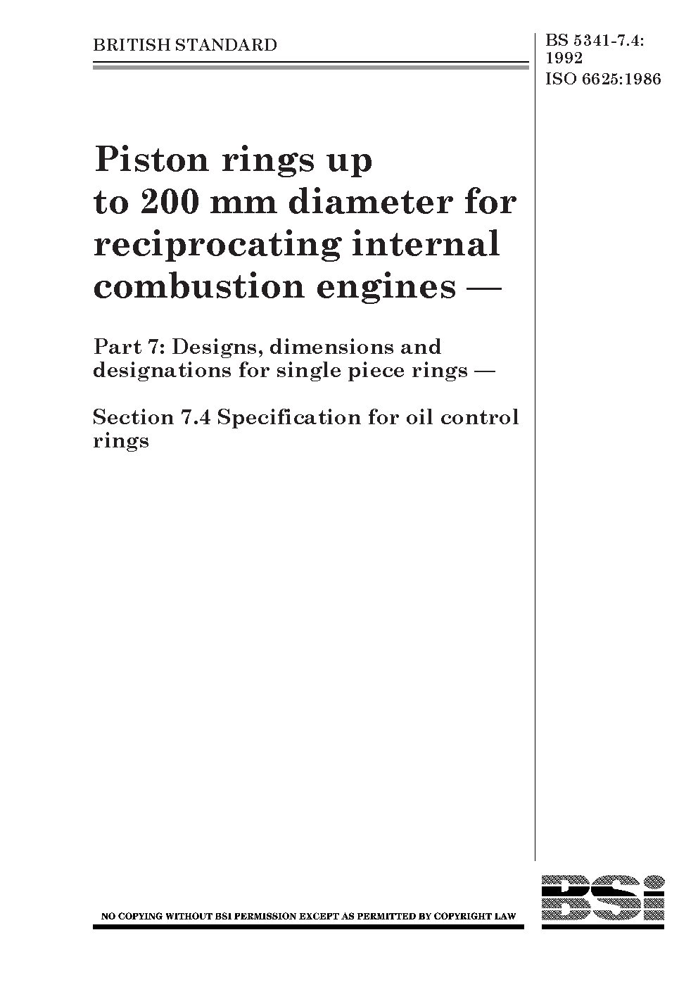 Piston rings up to 200 mm diameter for reciprocating internal combustion engines. Designs, dimensions and designations single piece rings. Specification oil control
