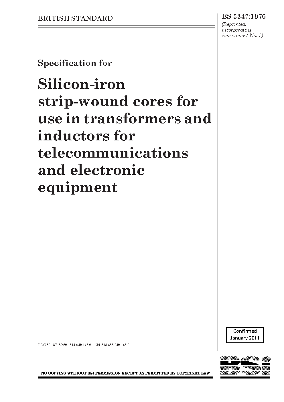 Specification for silicon-iron strip-wound cores for use in transformers and inductors for telecommunications and electronic equipment