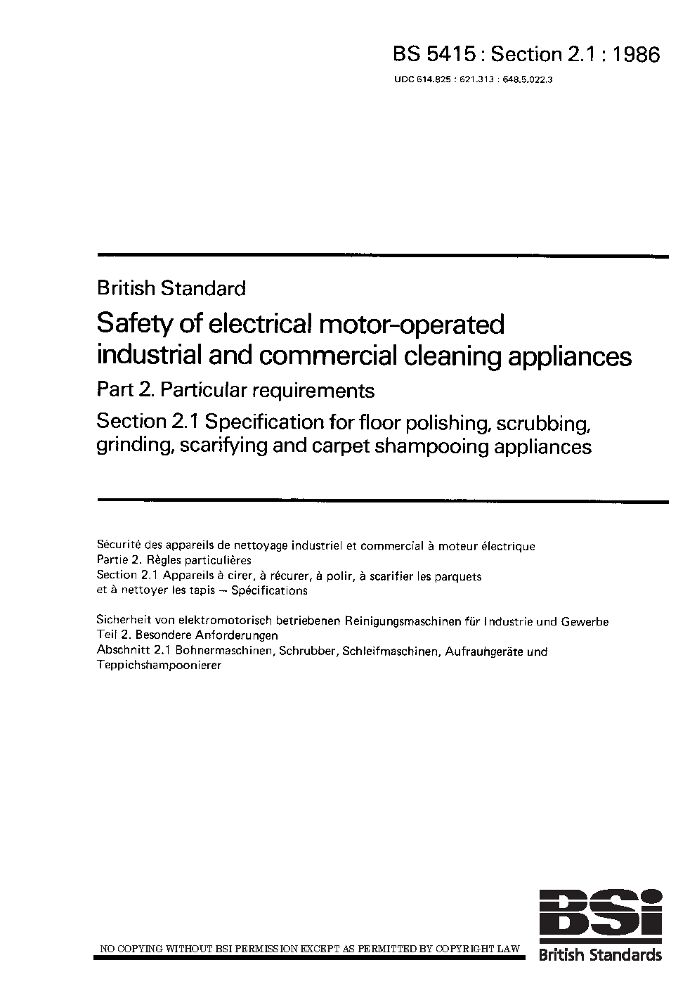 Safety of electrical motor-operated industrial and commercial cleaning appliances. Particular requirements Specification for floor polishing, scrubbing, grinding, scarifying carpet shampooing appliances