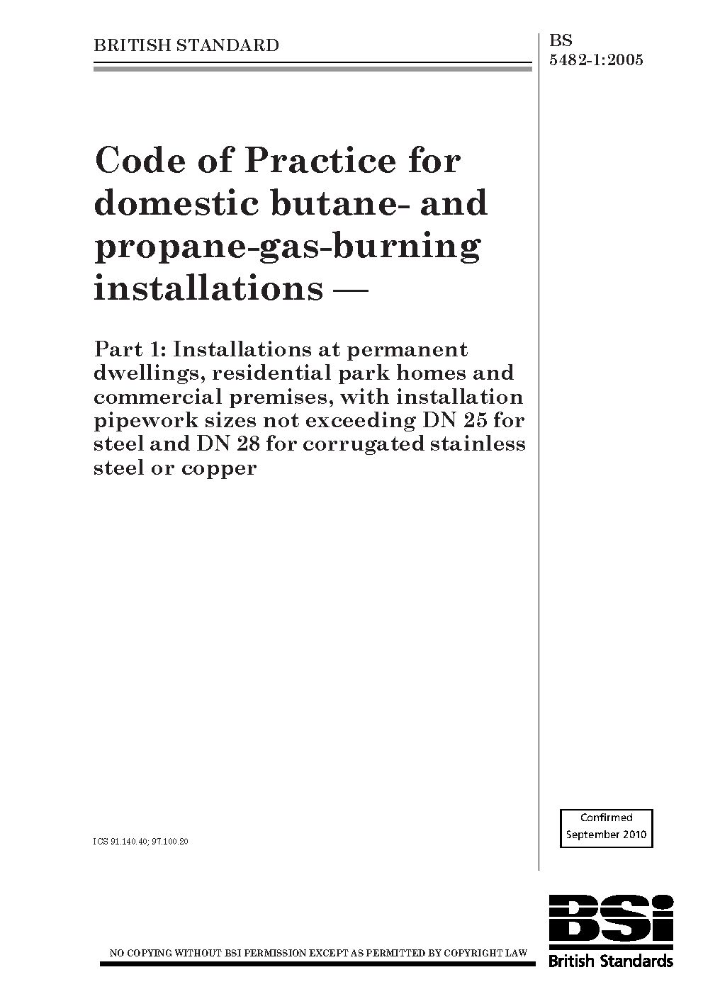 Code of practice for domestic butane- and propane-gas-burning installations Installations at permanent dwellings, residential park homes commercial premises, with installation pipework sizes not exceeding DN 25 steel 28 corrugated stainless or copper