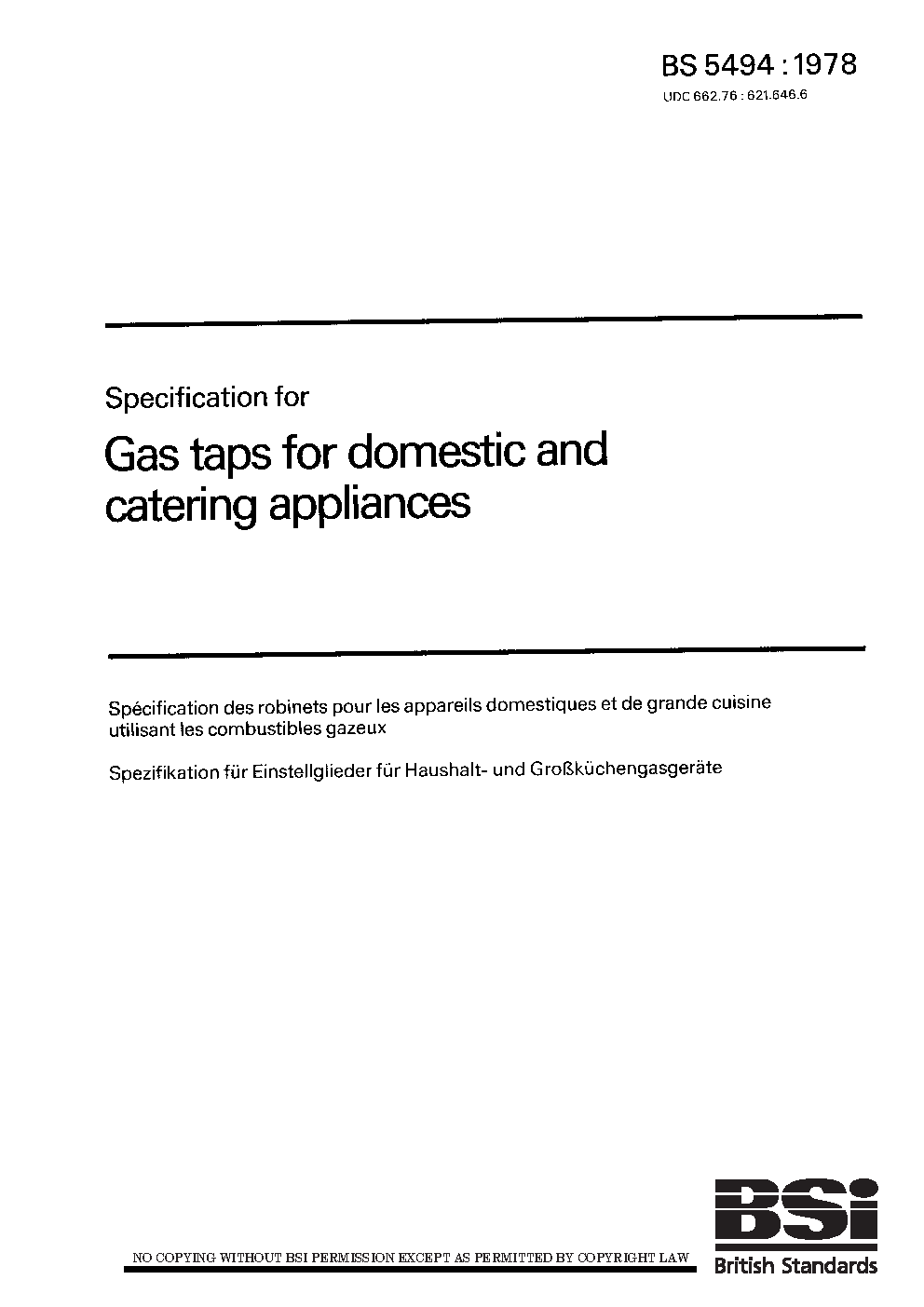 Specification for gas taps for domestic and catering appliances