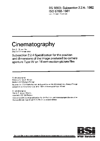 Cinematography. 16 mm film. Image areas Specification for the position and dimensions of image produced by camera aperture Type W on motion-picture film