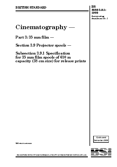 Cinematography. 35 mm film. Projector spools Specification for film of 610 m capacity (38 cm size) release prints