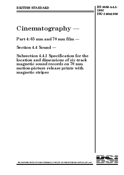 Cinematography. 65 mm and 70 film. Sound Specification for the location dimensions of six-track magnetic sound records on motion-picture release prints with stripes