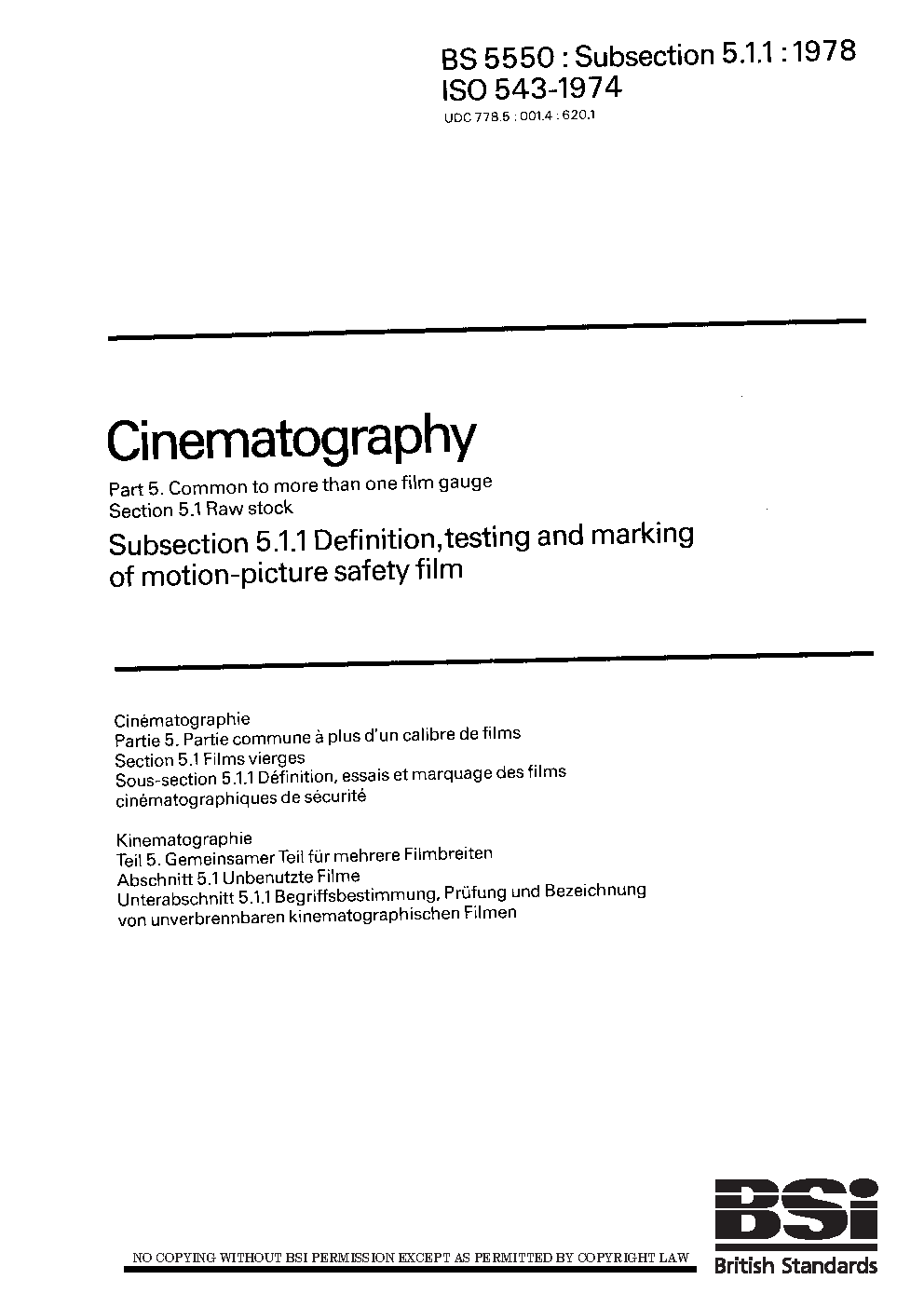 Cinematography. Common to more than one film gauge. Raw stock Definition, testing and marking of motion-picture safety