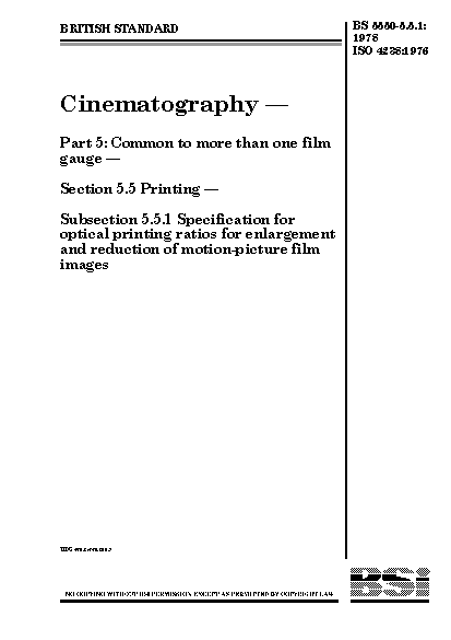 Cinematography. Common to more than one film gauge. Printing Specification for optical printing ratios enlargement and reduction of motion-picture images
