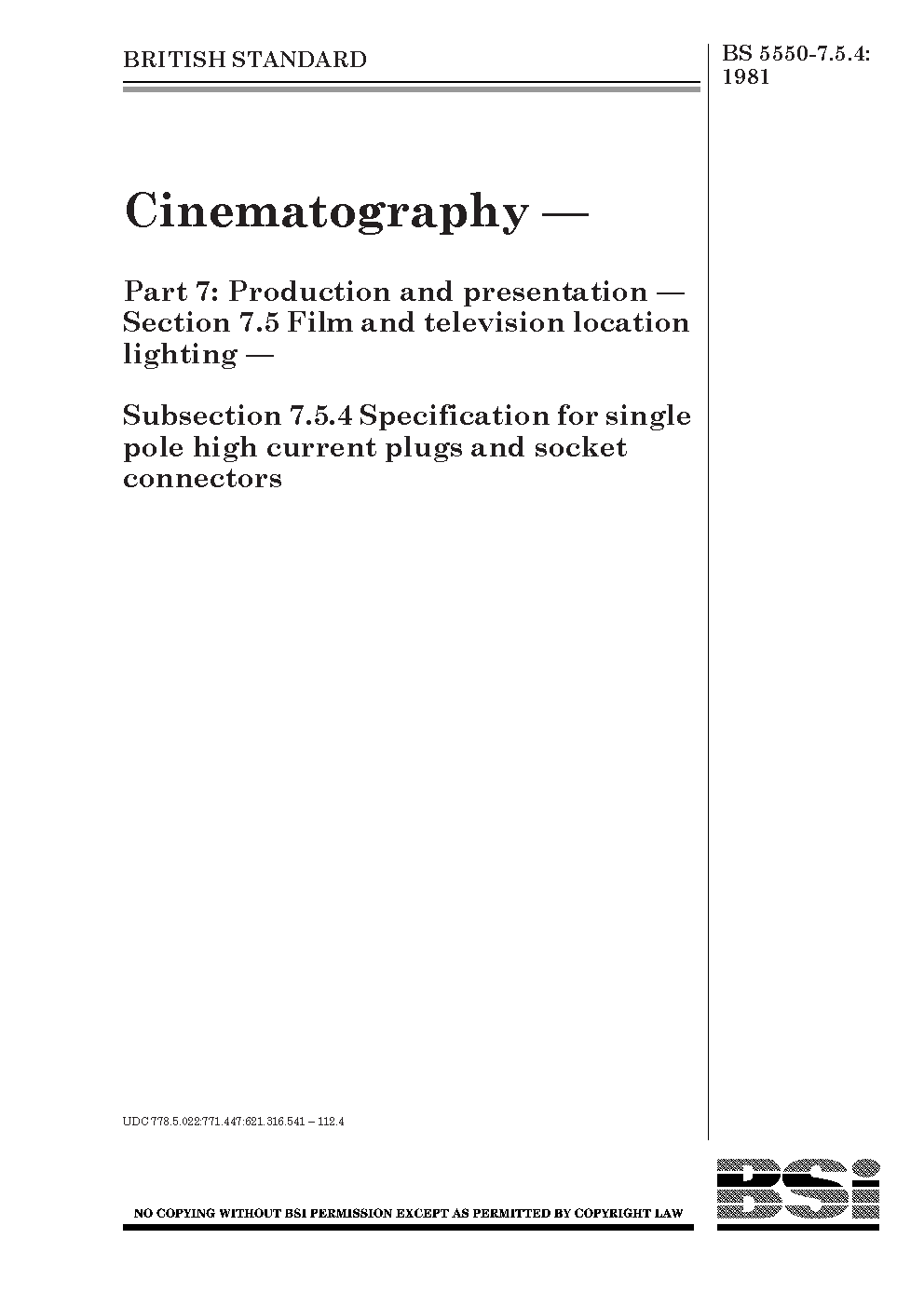 Cinematography. Production and presentation. Film television location lighting Specification for single pole high current plugs socket connectors