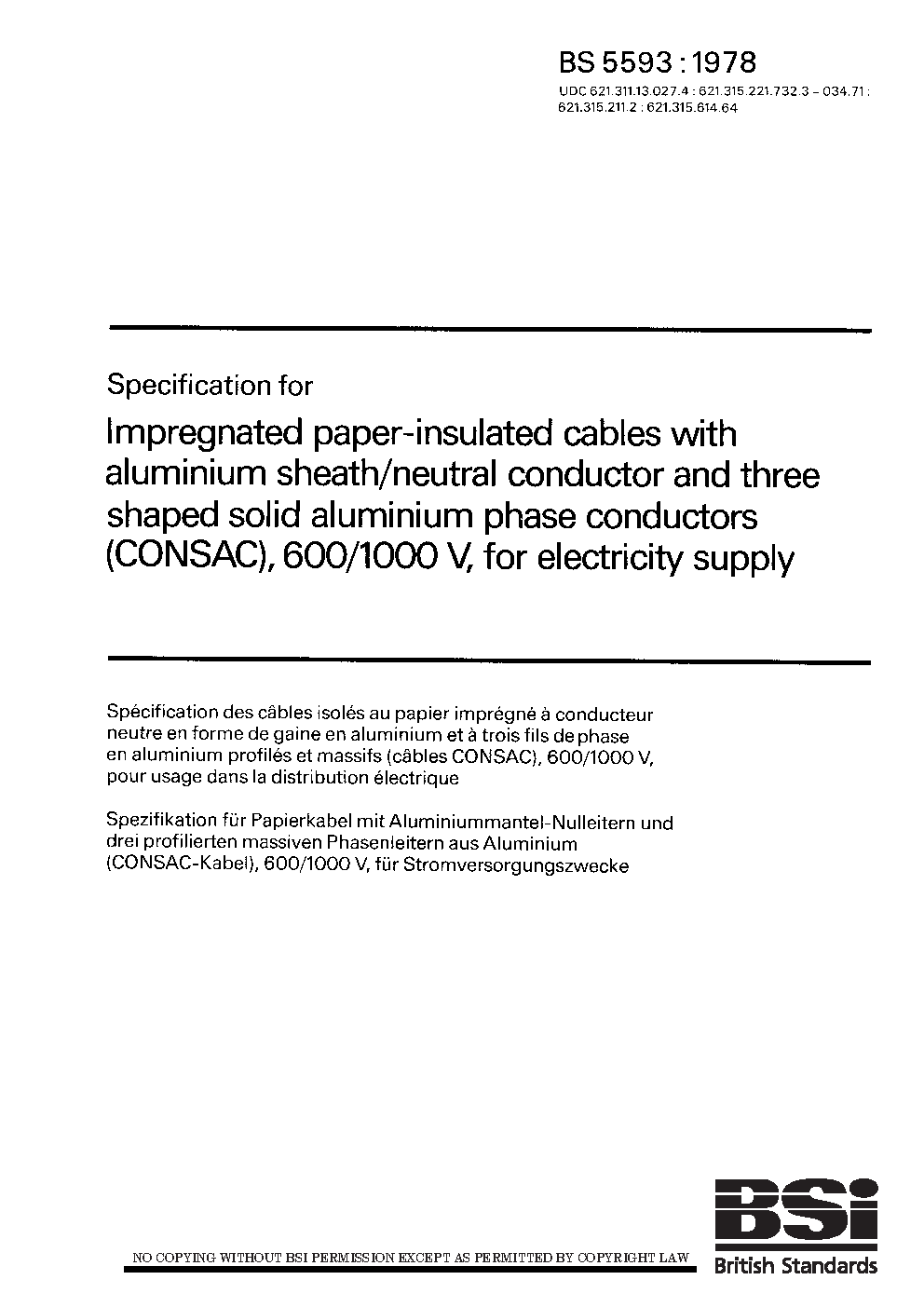 Specification for impregnated paper-insulated cables with aluminium sheath/neutral conductor and three shaped solid aluminium phase conductors (CONSAC), 600/1000 V, for electricity supply