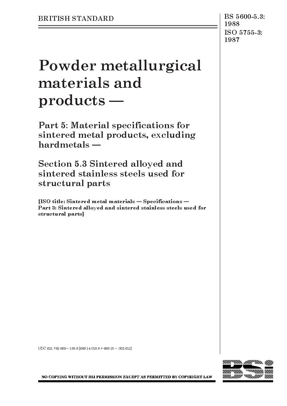 Powder metallurgical materials and products. Material specifications for sintered metal products, excluding hardmetals Sintered alloyed stainless steels used structural parts