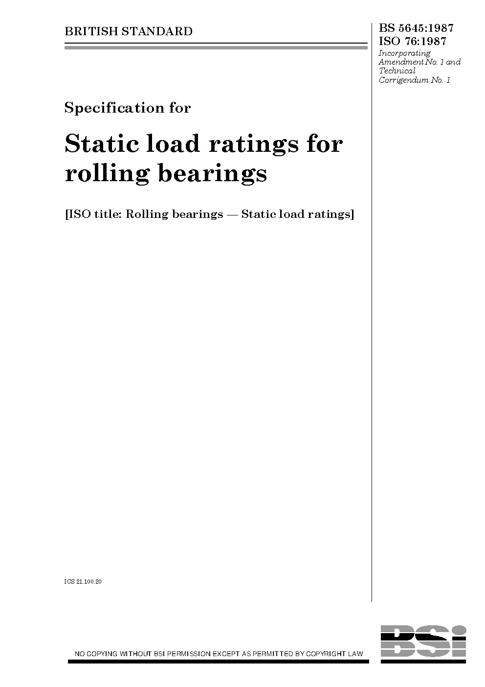 Specification for rolling bearings - static load ratings