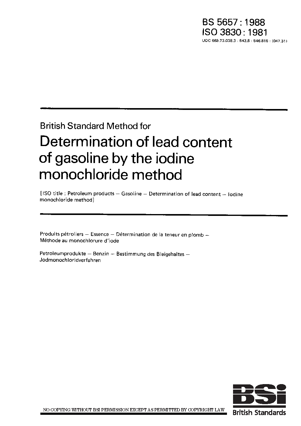 Petroleum products - gasoline - determination of lead content - iodine monochloride method
