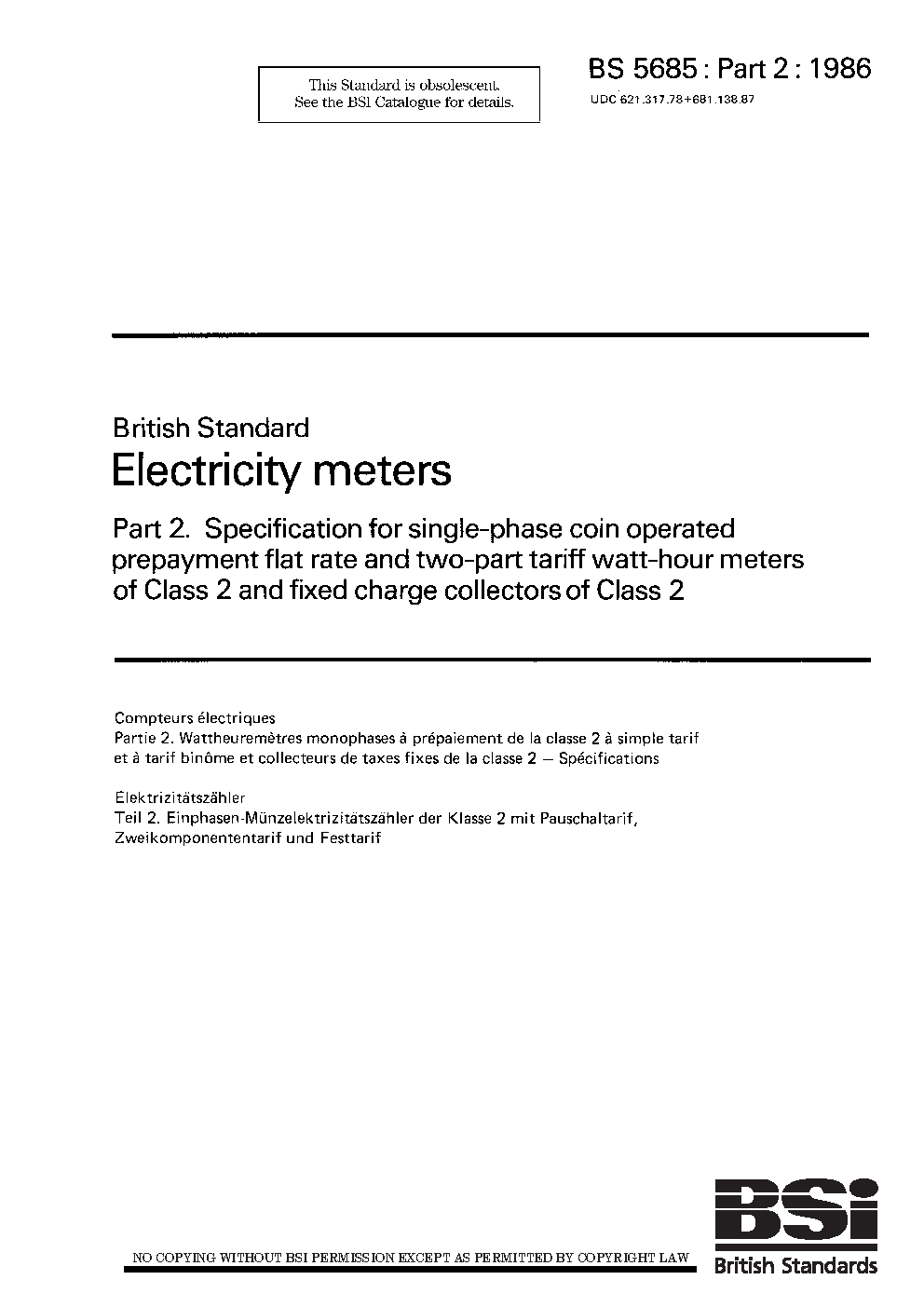 Electricity meters Specification for single-phase coin operated prepayment flat rate and two-part tariff watt-hour of Class 2 fixed charge collectors
