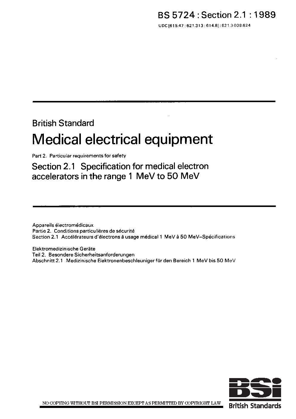 Medical electrical equipment. Particular requirements for safety Specification medical electron accelerators in the range 1 MeV to 50