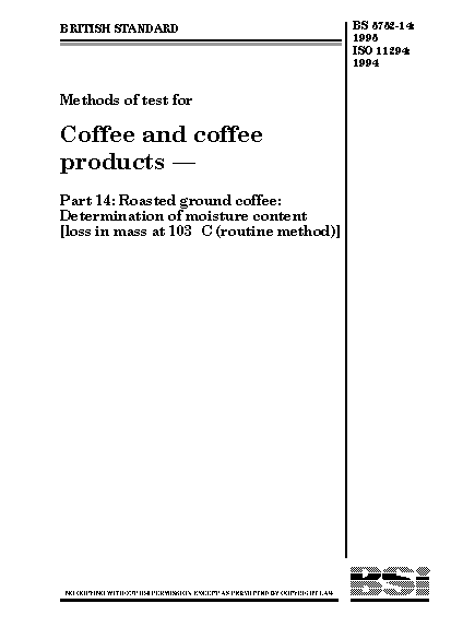 Methods of test for coffee and products Roasted ground coffee. Determination moisture content (loss in mass at 103°C (routine method)