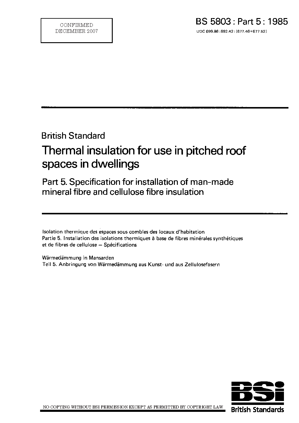 Thermal insulation for use in pitched roof spaces dwellings Specification installation of man-made mineral fibre and cellulose
