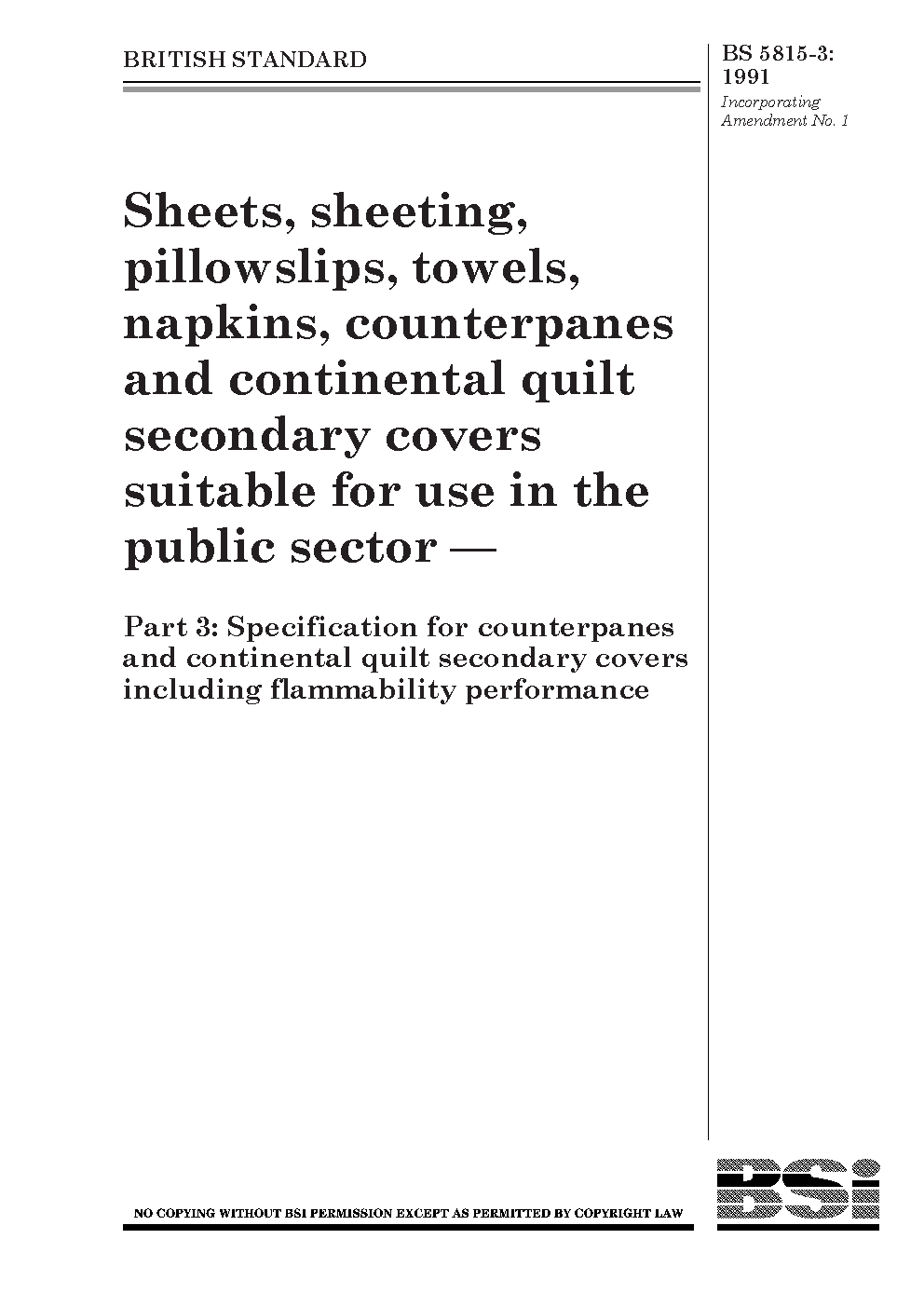 Sheets, sheeting, pillowslips, towels, napkins, counterpanes and continental quilt secondary covers suitable for use in the public sector Specification including flammability performance