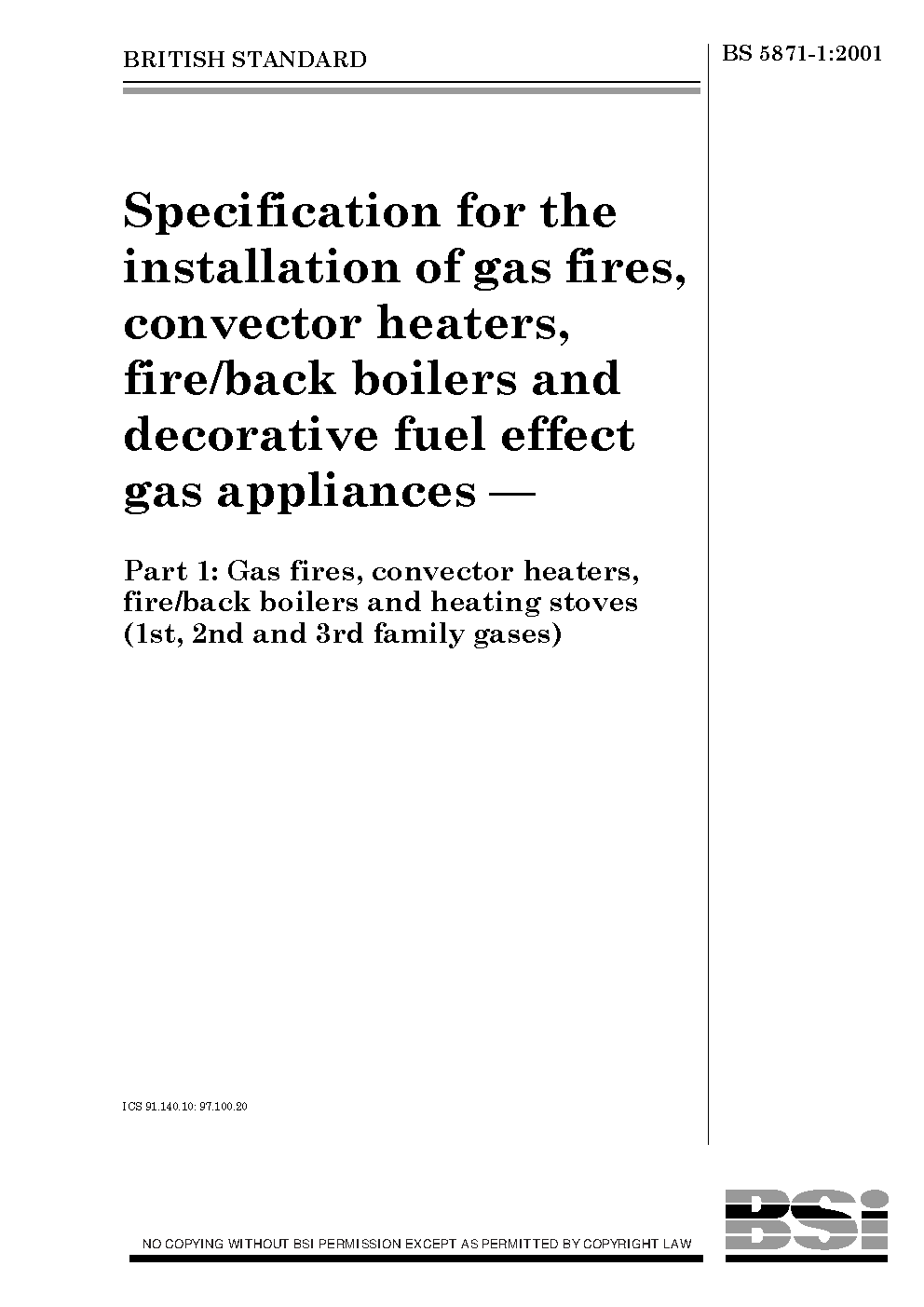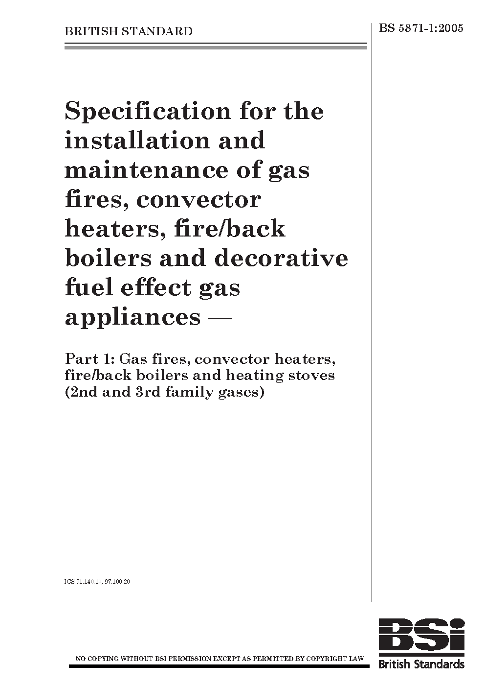Specification for the installation and maintenance of gas fires, convector heaters, fire/back boilers decorative fuel effect appliances Gas heating stoves (2nd 3rd family gases)