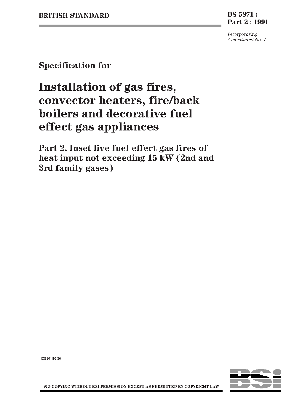 Specification for installation of gas fires, convector heaters, fire/back boilers and decorative fuel effect appliances Inset live fires heat input not exceeding 15 kW (2nd 3rd family gases)