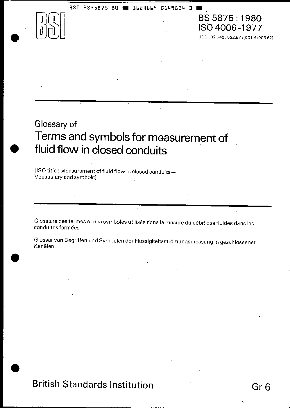 Glossary of terms and symbols for measurement of fluid flow in closed conduits