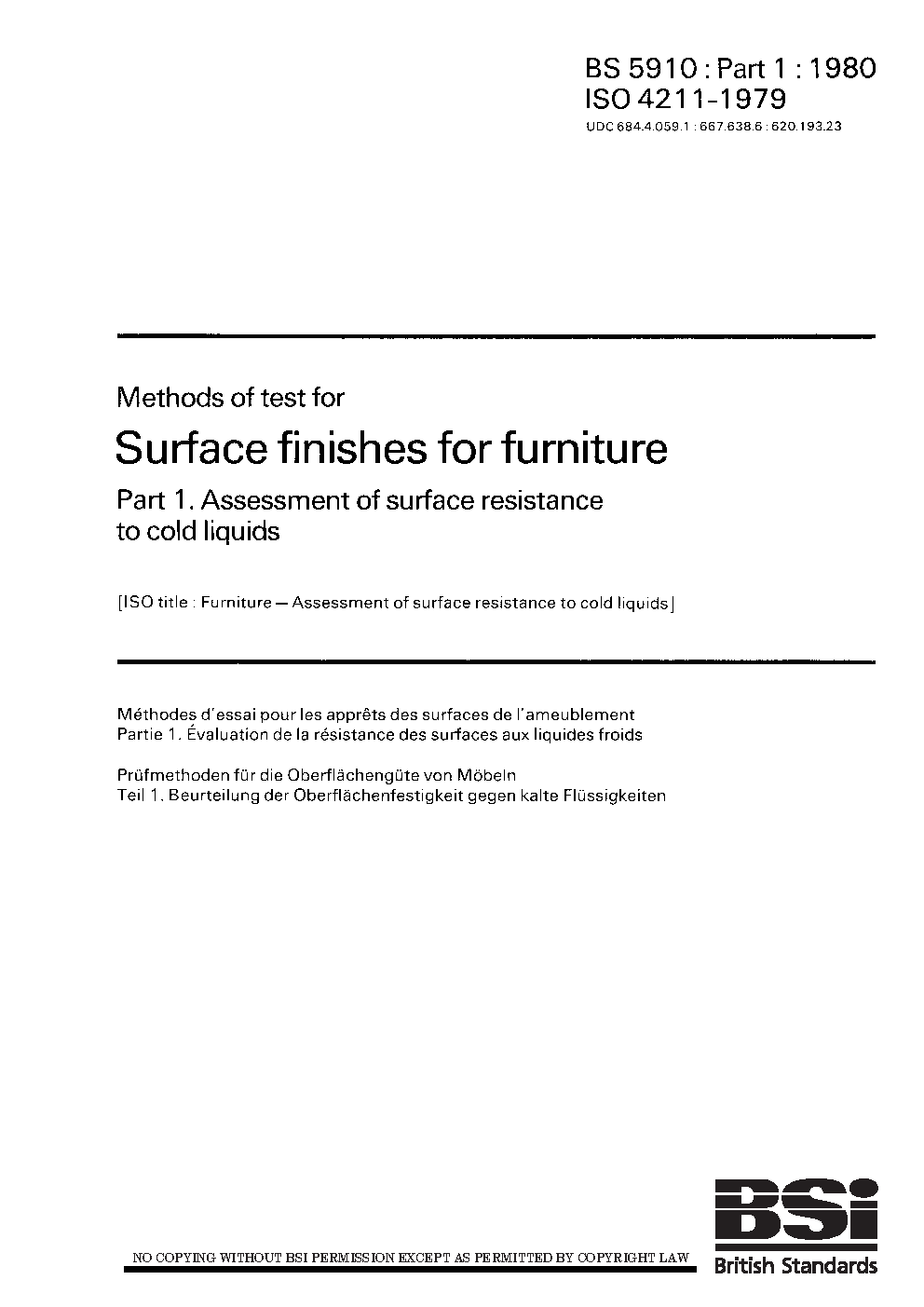 Methods of test for surface finishes furniture Assessment resistance to cold liquids