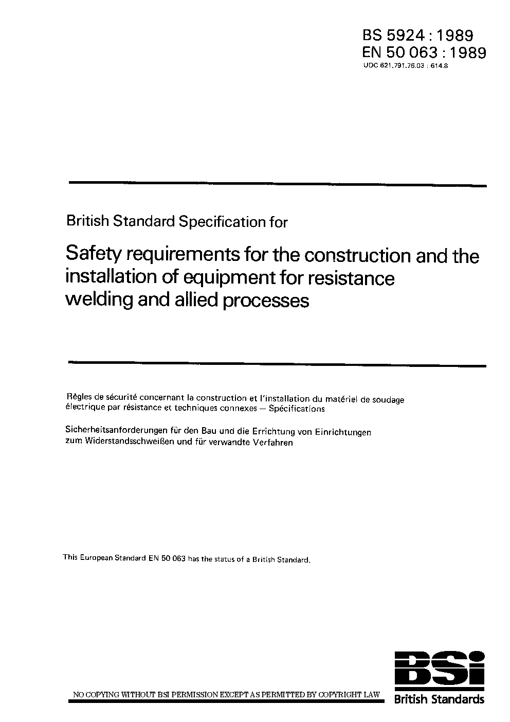Specification for safety requirements for electrical equipment of machines for resistance welding and allied processes