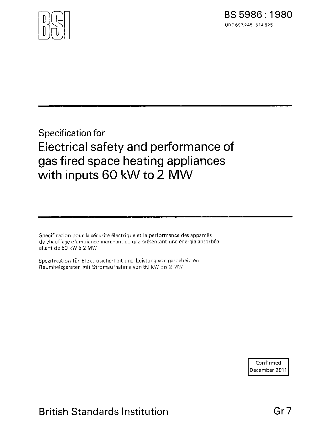 Specification for electrical safety and performance of gas fired space heating appliances with inputs 60 kW to 2 MW