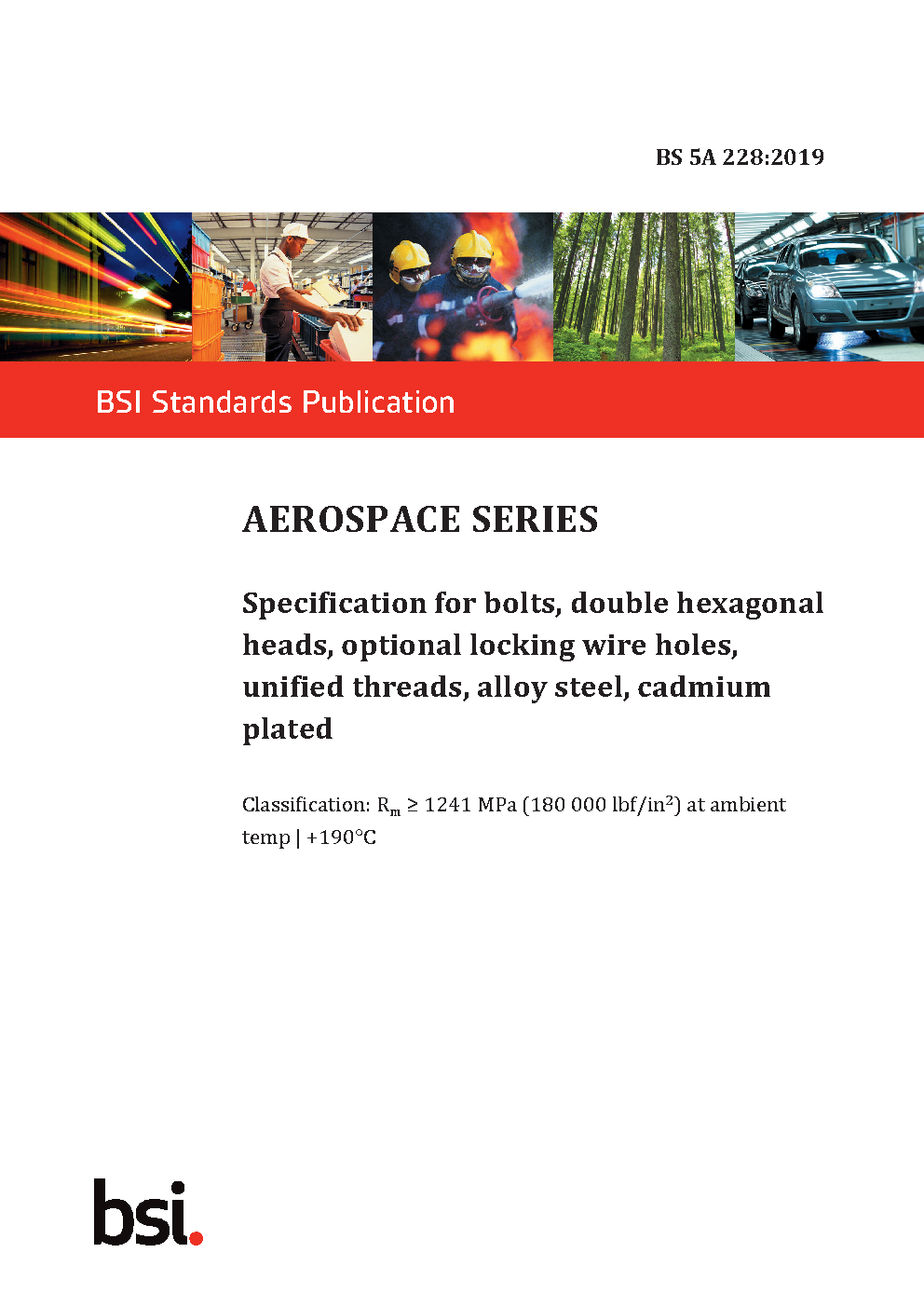 Specification for bolts, double hexagonal heads, optional locking wire holes, unified threads, alloy steel, cadmium plated. Classification: Rm = 1241 MPa (180 000 lbf/in2) at ambient temp | +190°C