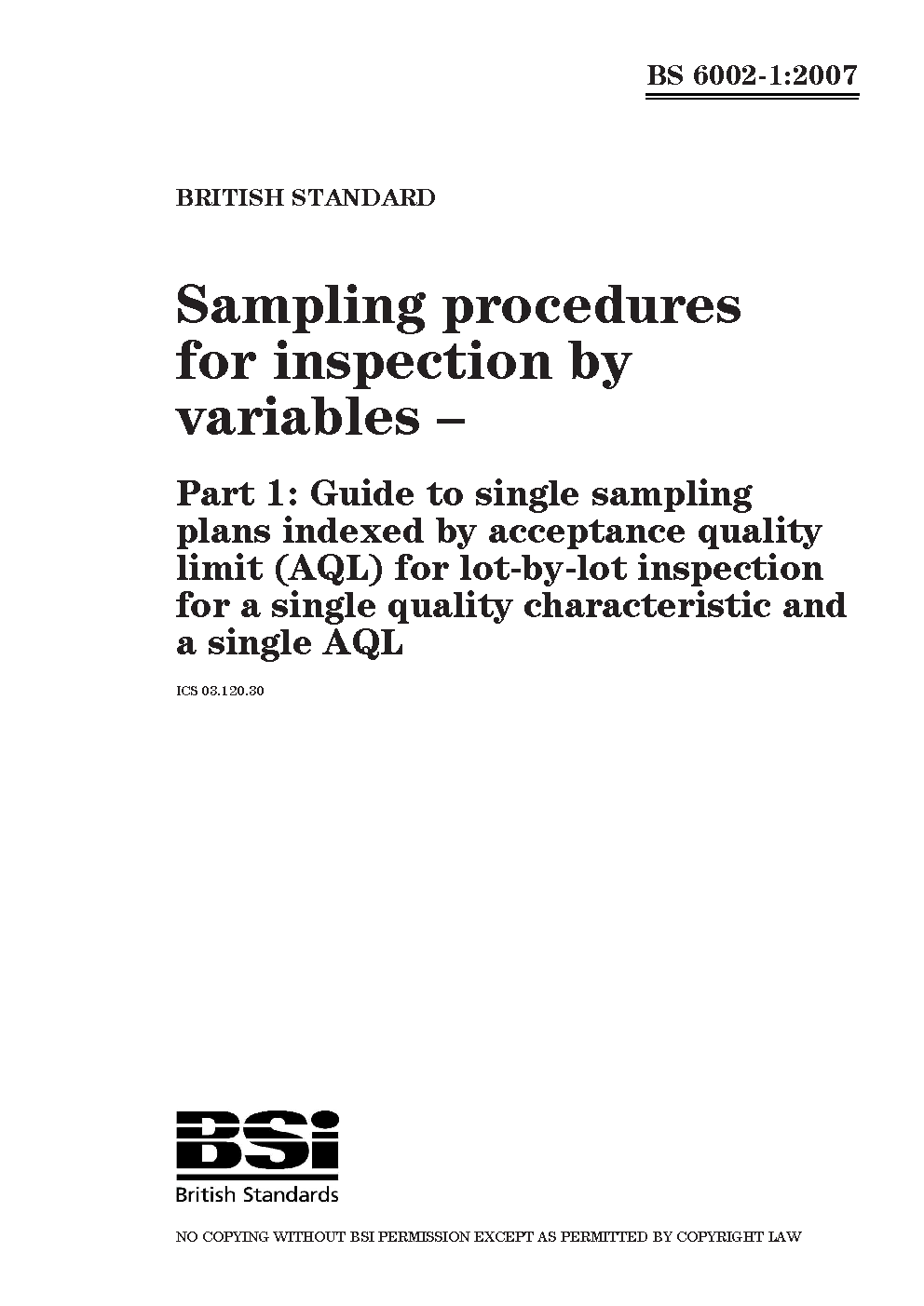 Sampling procedures for inspection by variables Specification single sampling plans indexed acceptable quality level (AQL) lot-by-lot