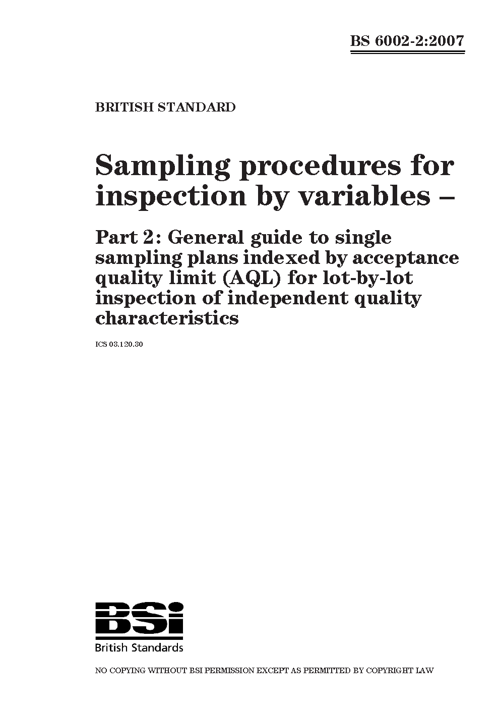 Sampling procedures for inspection by variables General guide to single sampling plans indexed acceptance quality limit (AQL) lot-by-lot of independent characteristics