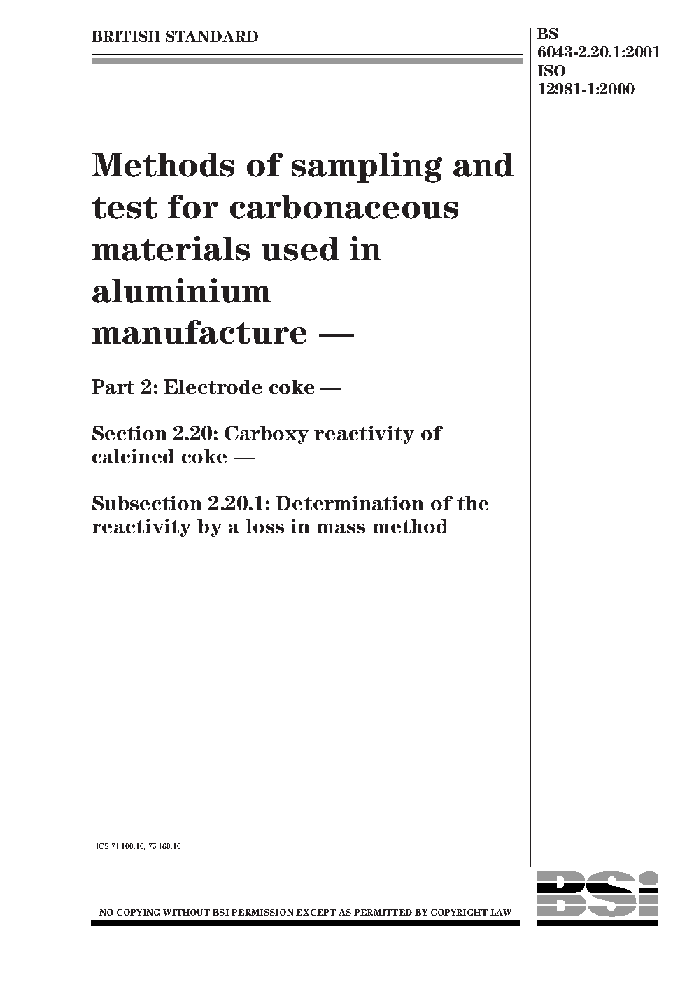 Methods of sampling and test for carbonaceous materials used in aluminium manufacture. Electrode coke. Carboxy reactivity calcined coke Determination the by a loss mass method Section 2.20: Subsection 2.20.1: