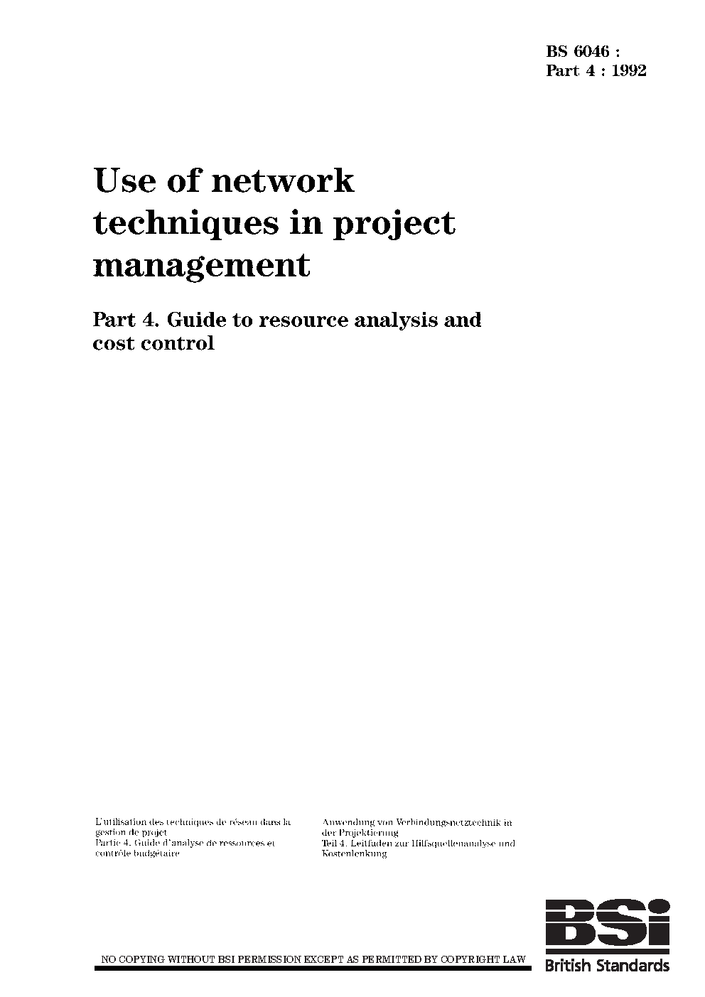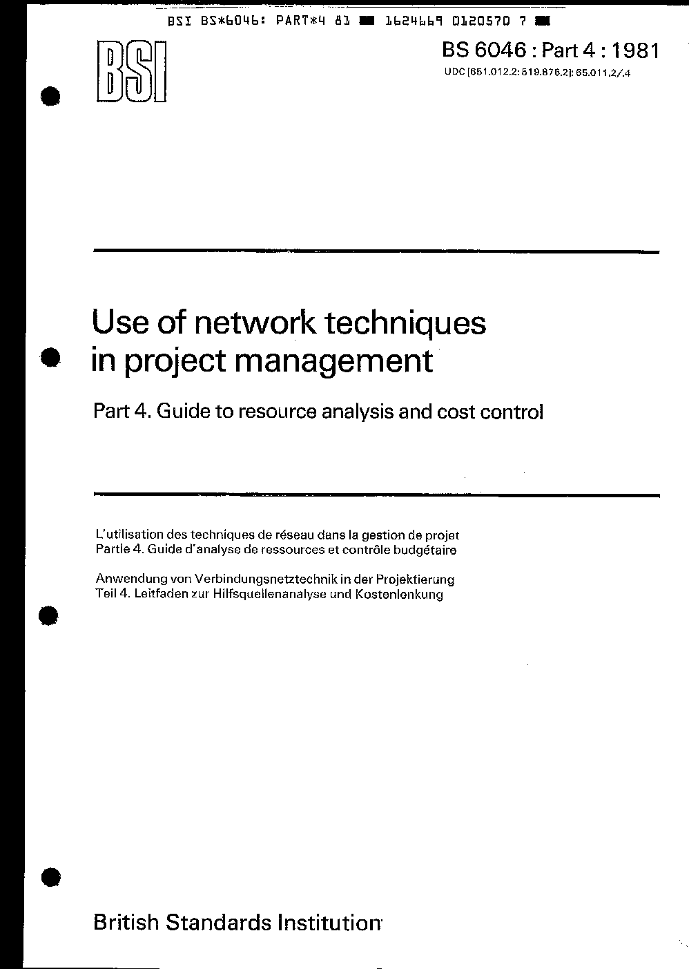 Use of network techniques in project management Guide to resource analysis and cost control